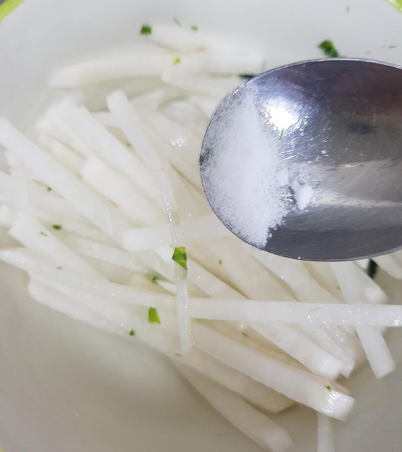 무는 채썰어서 설탕, 식초에 절여 주세요.